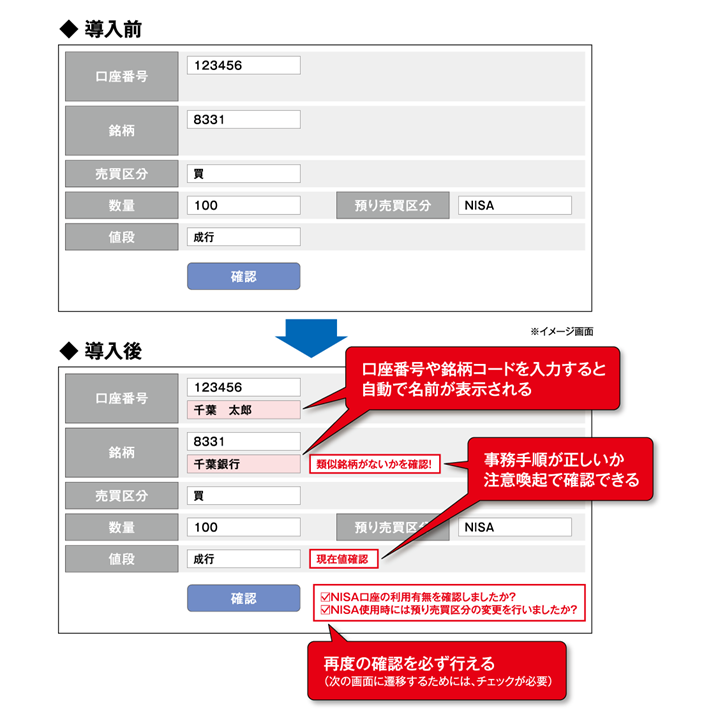 「たとえばNISA口座の利用有無については、注文時に必ず確認する必要があります。『NISA口座利用の有無を確認しましたか?』といったチェック項目を設け、チェックを入れなければ次の画面に進めない仕様としました。操作フロー内にチェック作業を物理的に組み込むことで、アドバイザーは正しい事務手順に沿って対応でき、注文受発注のヒューマンエラーを確実に防ぐことができます」