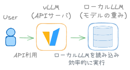手元に保存したローカルLLMを、vLLMが読み込み、高速かつ効率的に推論を実行します。