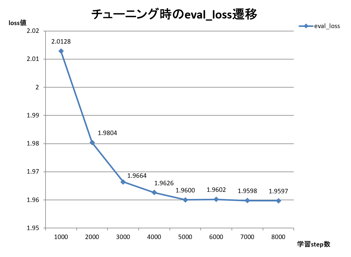 eval_loss値は、検証の3回目のタイミングで、前の検証時よりも上がり始めてしまいました。