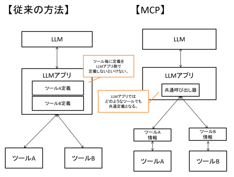 MCPを使うことで、この部分は手を加えず(LLMアプリ側に作らずに)対応ができるようになります。
