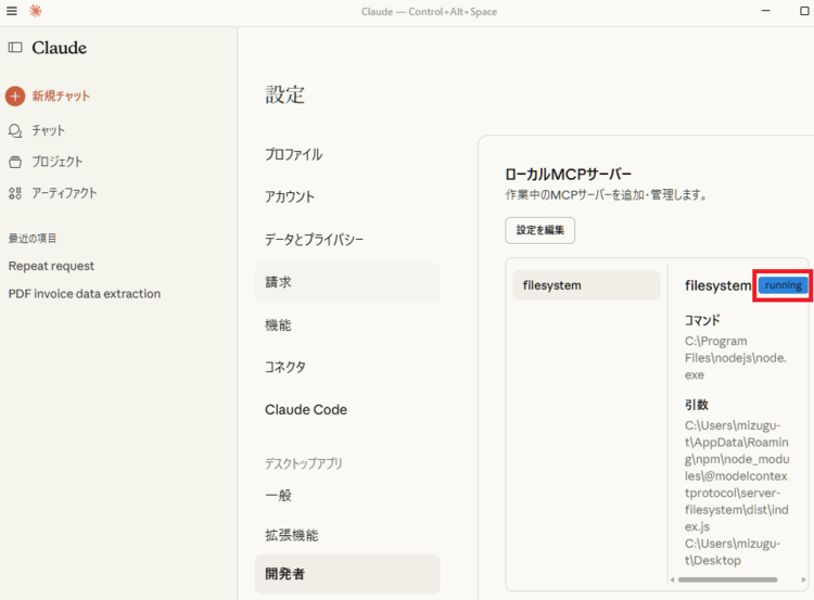 Claude for Desktopを再起動し、ファイル > 設定 > 開発者を指定して、filesystemが期待通りに起動しているかを確認します。