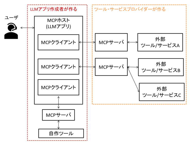 この場合、ツールを使ってほしい人がMCPサーバを用意し、LLMアプリ作成者は様々な人が用意したMCPサーバを使う、という構成が可能です。
