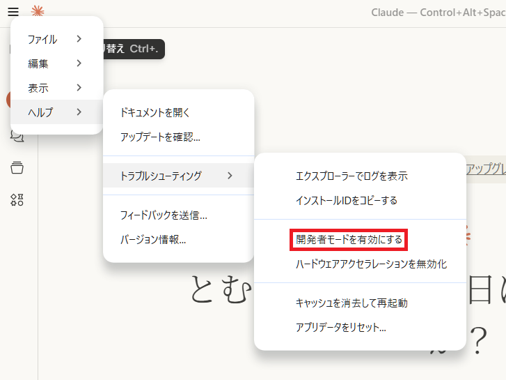 図5 Claude for Desktopにて「開発者オプション」を有効化するには