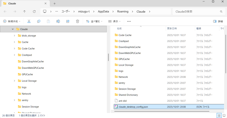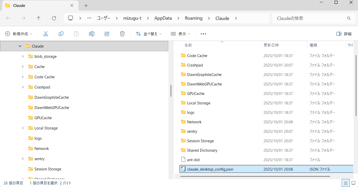 claude_desktop_config.jsonが選択された状態でエクスプローラが表示されます。