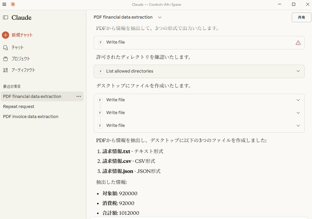 PDFを読み取り、結果を画面及び指定したディレクトリ(今回はデスクトップ)に出力してくれます。