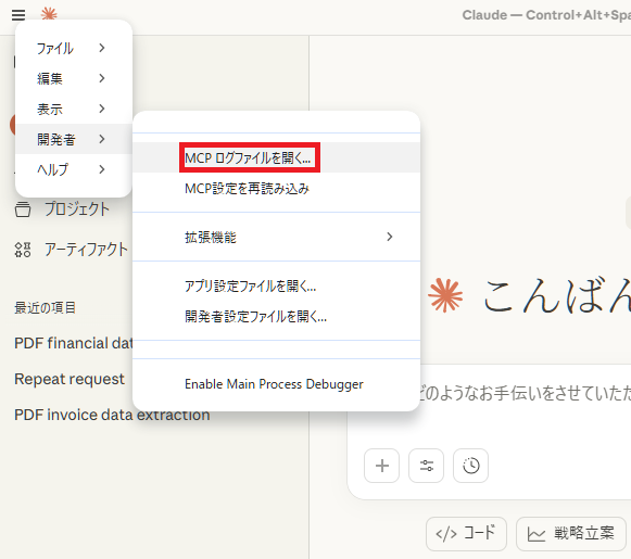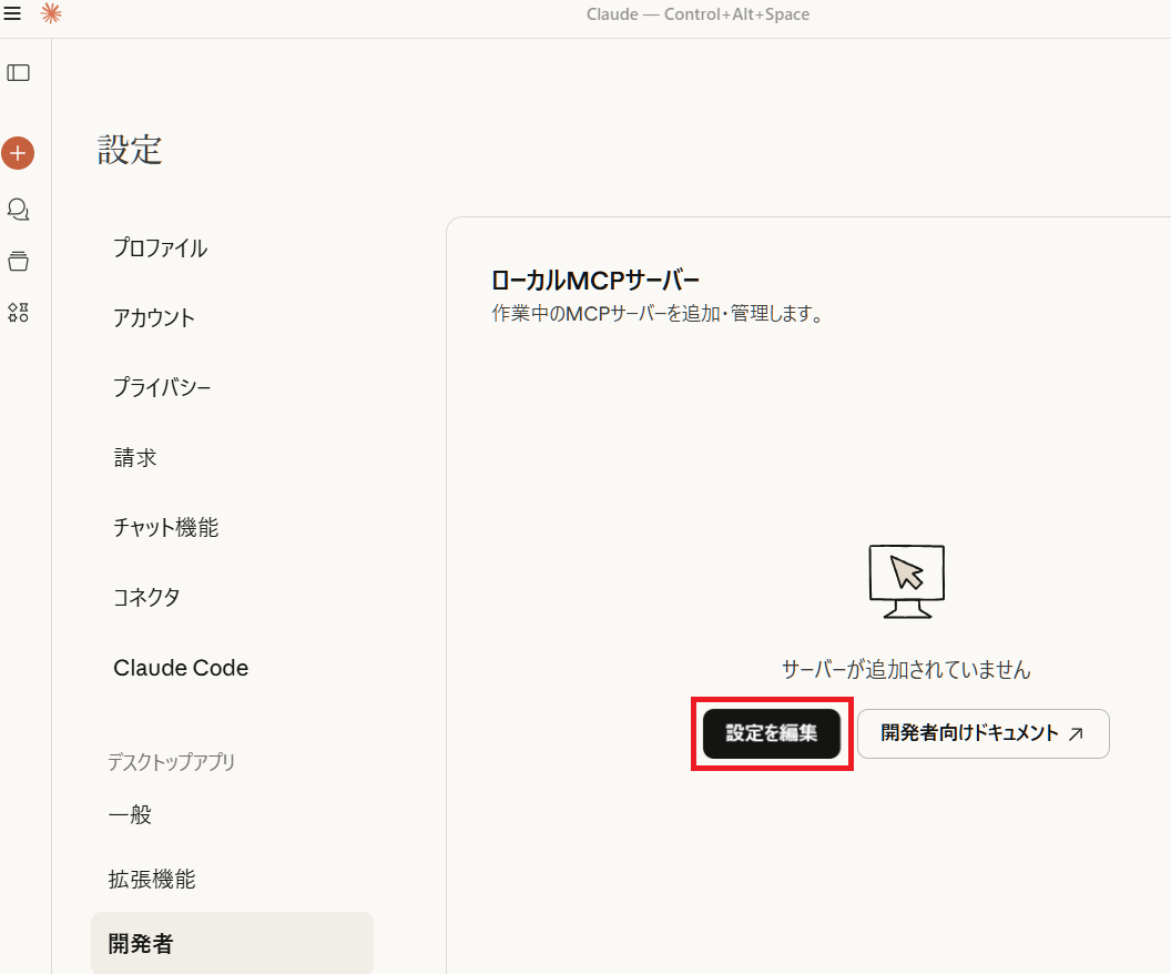 Claude for Desktopを起動し、開発者モードを有効にします。