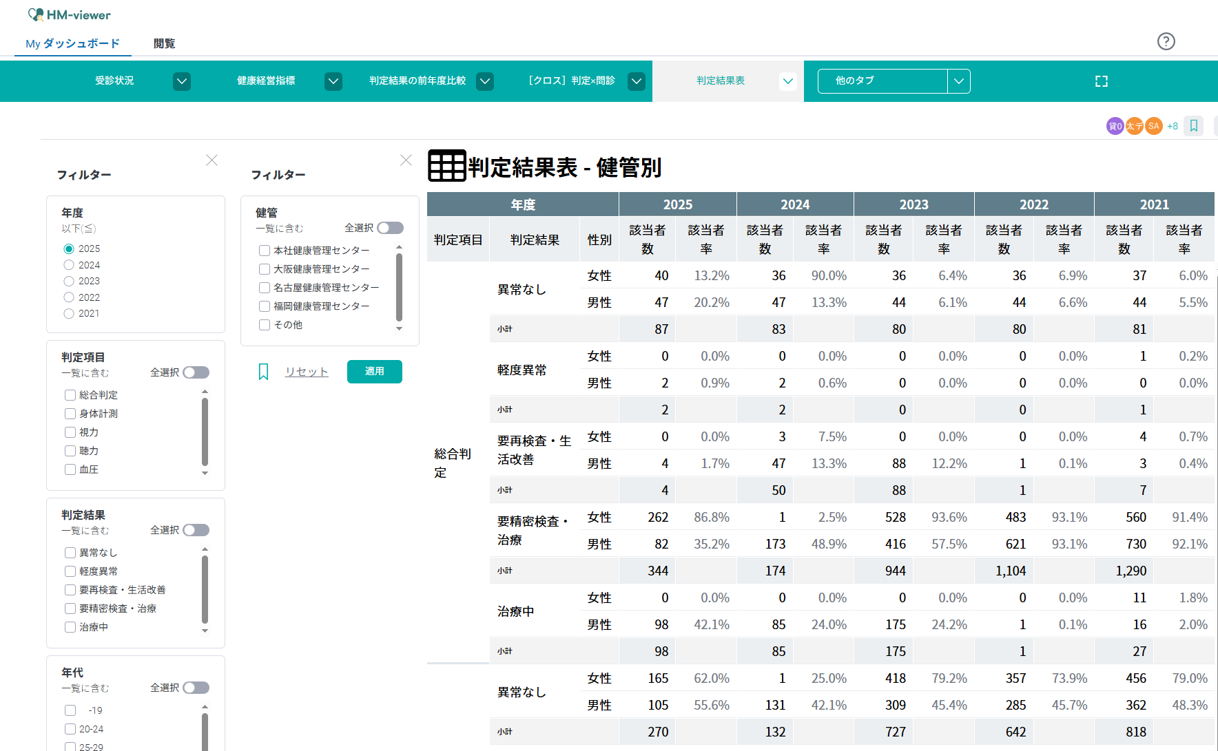 集計と分析機能も充実しており、その結果は見やすいダッシュボード画面で確認できます。労基署集計のほか、産業医意見書、紹介状、健診結果票、特殊健診個人票、ストレスチェック結果票なども作成可能です。産業保健スタッフをはじめとする健康管理部門の事務的な作業を大幅に効率化できます。