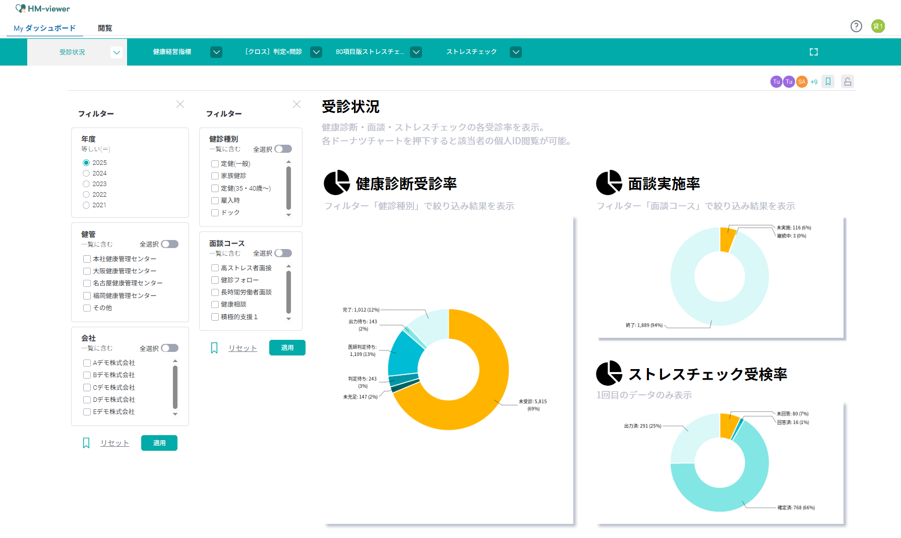 健康診断、面談、ストレスチェックなどの受診率を一目で確認できる。 フィルターの選択で対象者やコースを絞り込むことも可能だ。ドーナツチャートの各項目を選択すれば、個人ID閲覧も可能。