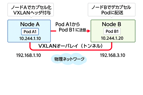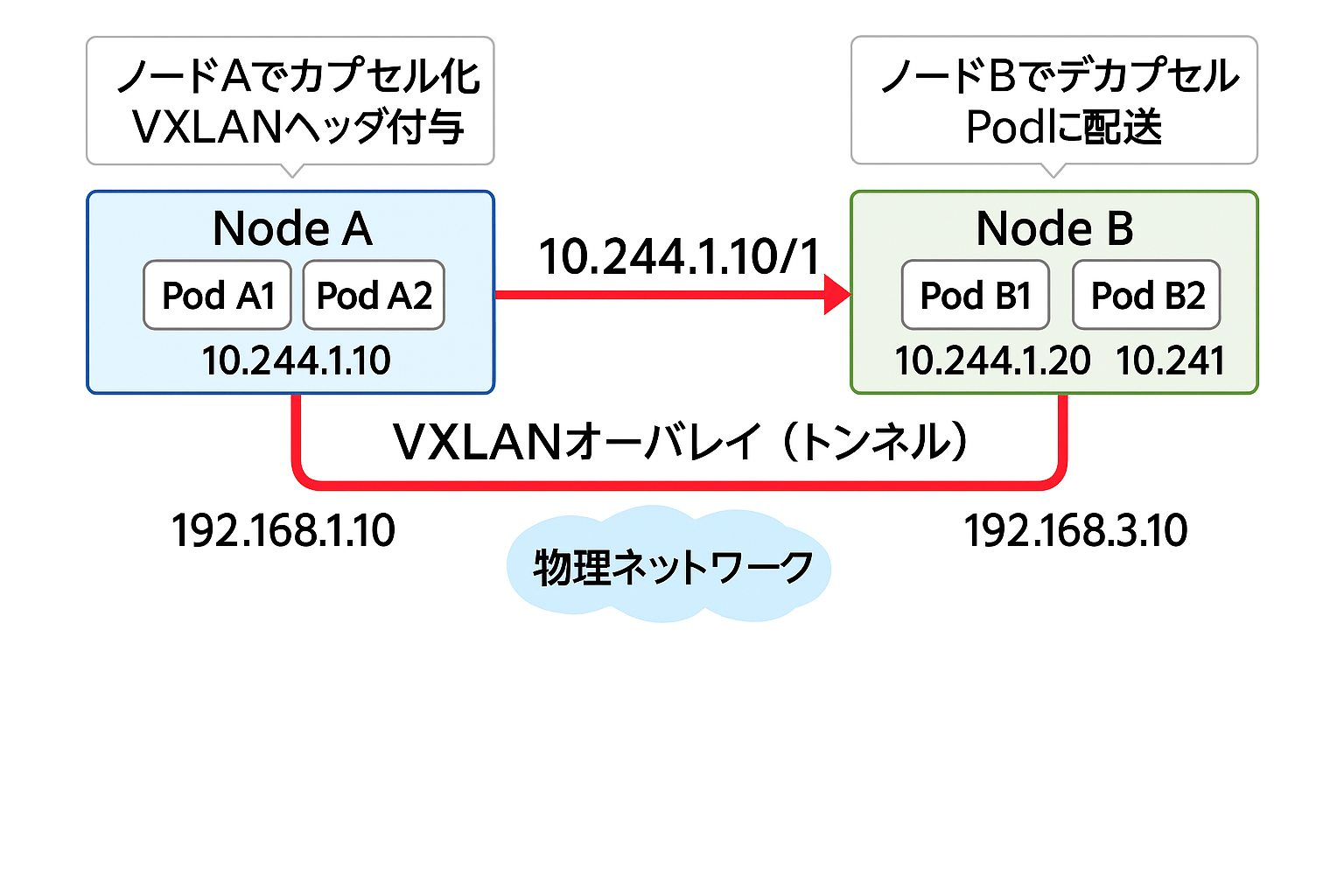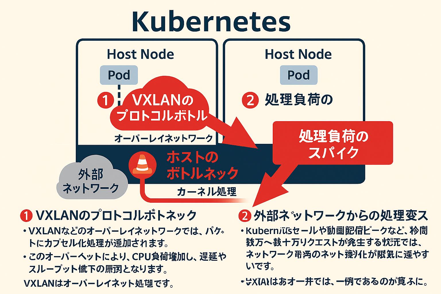 補足:VXLANなどのオーバーレイネットワークは、多くのCNIプラグイン(Flannel、Weave Net、Ciliumの一部モードなど)で採用されています。これらのオーバーレイ技術はパケットのカプセル化・復号処理にCPU負荷がかかるため、オーバーヘッドが発生します。一方、CalicoのBGPモードや一部のCNIはオーバーレイを使わず、L3ルーティングを活用するため、このオーバーヘッドを軽減できます。本記事では、代表的なオーバーレイ技術の課題を中心に解説していますが、CNIの選択によって性能課題の度合いは異なります。