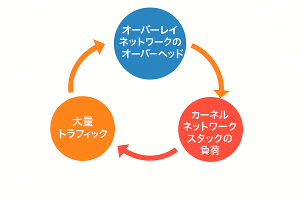 まとめると、オーバーレイネットワークのオーバーヘッドがカーネルネットワークスタックの負荷を増大させ、その結果として大量トラフィック時にネットワーク性能のボトルネックが顕在化するという因果関係があります。これらの問題は独立しているのではなく、連鎖的に影響し合いながらKubernetesネットワークの性能課題を形成しています。