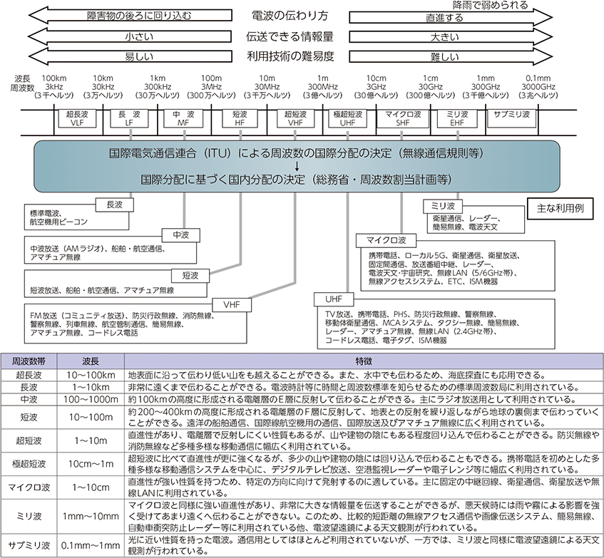 「周波数が高いと速度が出せる」と「周波数が低いと遠くまで飛ぶ」という関係を通信だけでなく |