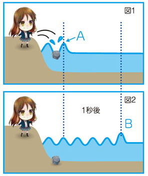 電磁波が伝わる様子は水面の波のような性質を持っています。例えば池に石を放り投げると波紋が広がりますが、投げ入れた瞬間にできた波は例えば1秒後には次の位置に進みます。概念的には電磁波も同じように空間を伝わっていきます。
