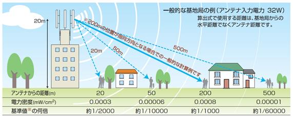 それを踏まえての以下の説明はすべて理論値ですが、上記の図でいうとアンテナから200メートル離れた見通しの地表を目標に32ワットのアンテナ入力電力により電波が放射される設計になっていて、その地点で受信される電力密度(ここでは「受信する電波の強さを示す単位である」とだけご理解ください)は0.0008mW/㎠。それに対してその手前の20メートルだとアンテナの向く方向から外れますが距離は10分の1で遮蔽物は無いので受信できる電力は0.0003mW/㎠。それに対して50メートルの距離だと樹木や家屋が邪魔になるのでアンテナを見通せる200メートルの位置より受信電力は下がり、500メートルの位置だと障害物に加え物理的に距離があるのでさらに受信電力は下がるという例です。