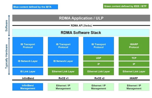 単一ブロードキャストドメインで動作するイーサネットフレームベースのRoCEv1とIP/UDP上で動作するRoCEv2があります。
