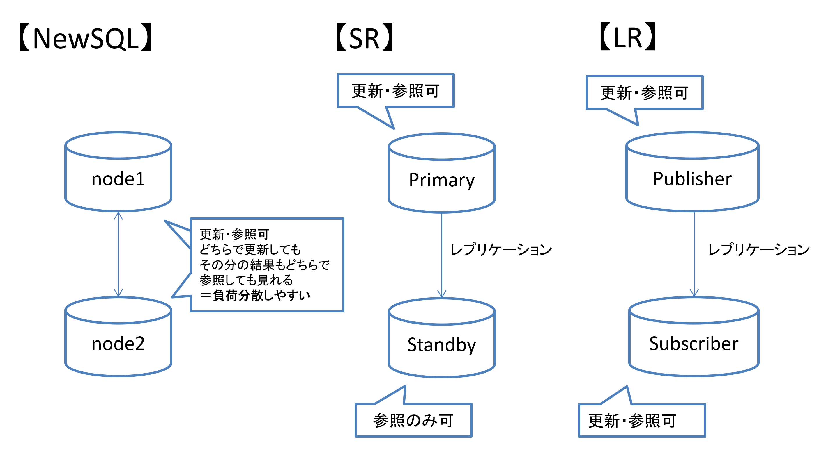 | ロジカルレプリケーション(LR) | パブリッシャ―もサブスクライバーも更新・参照可能。 |