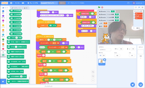 機械学習のプログラミング体験は、デジタルツイン事業部の神長が担当しました。 この体験では、機械学習のプログラミングに特化したScratch3『Stretch3(ML2Scratch)』を使い、『ジャンケンアプリ(ゲームアプリ)』のプログラミングを行いました。( 「Scratchではじめる機械学習 ―作りながら楽しく学べるAIプログラミング (オライリー・ジャパン)」 に掲載されているプログラムを利用してます。)