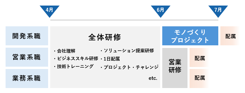 当社の新入社員研修は、前半は全体研修として職種を問わず全員がビジネスマナーやビジネスマインド、ITに関する基礎的な知識などを学び、後半はそれぞれの職種に応じた専門的なスキルを身に付けるために、職種別に学びを深めていく構成となっています。