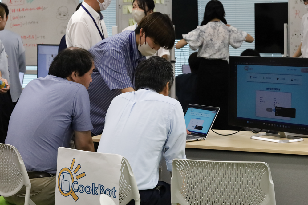 モノPの最後には、それぞれのチームがモノPでの取り組みの成果を披露する場として、社内向けに展示会と発表会が行われ、業務の合間を縫って、多くの先輩社員が展示会や発表会を訪れていました。