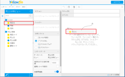 ビューを選択するとレポート作成用の画面に遷移します。Yellowfinのレポートは全てこの画面でドラッグ&ドロップの操作でレポート作成ができます。![]()