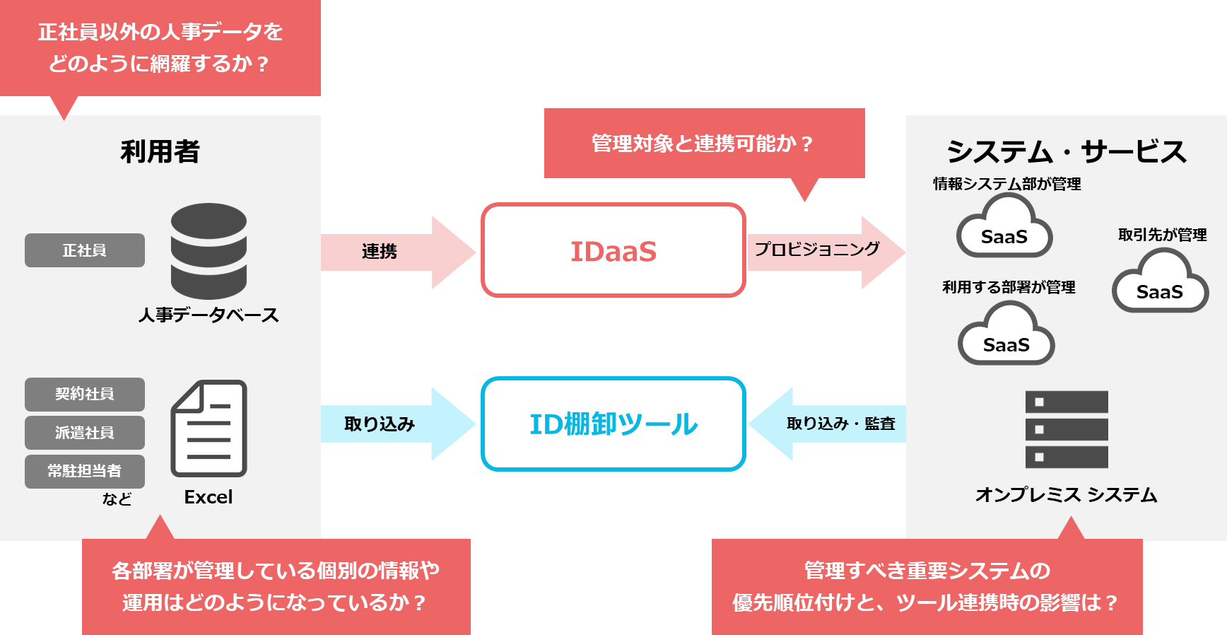 IDaaSでは、人事データベースなどを「正となるユーザ情報」として連携する必要があります。派遣社員・常駐している取引先社員など「SaaSのIDはあるが、人事システム上では管理していない」ケースも多くあります。“人”に関する情報が統合管理できている状態は理想ではありますが、業務や契約などの都合から一筋縄ではいかないのも現状です。