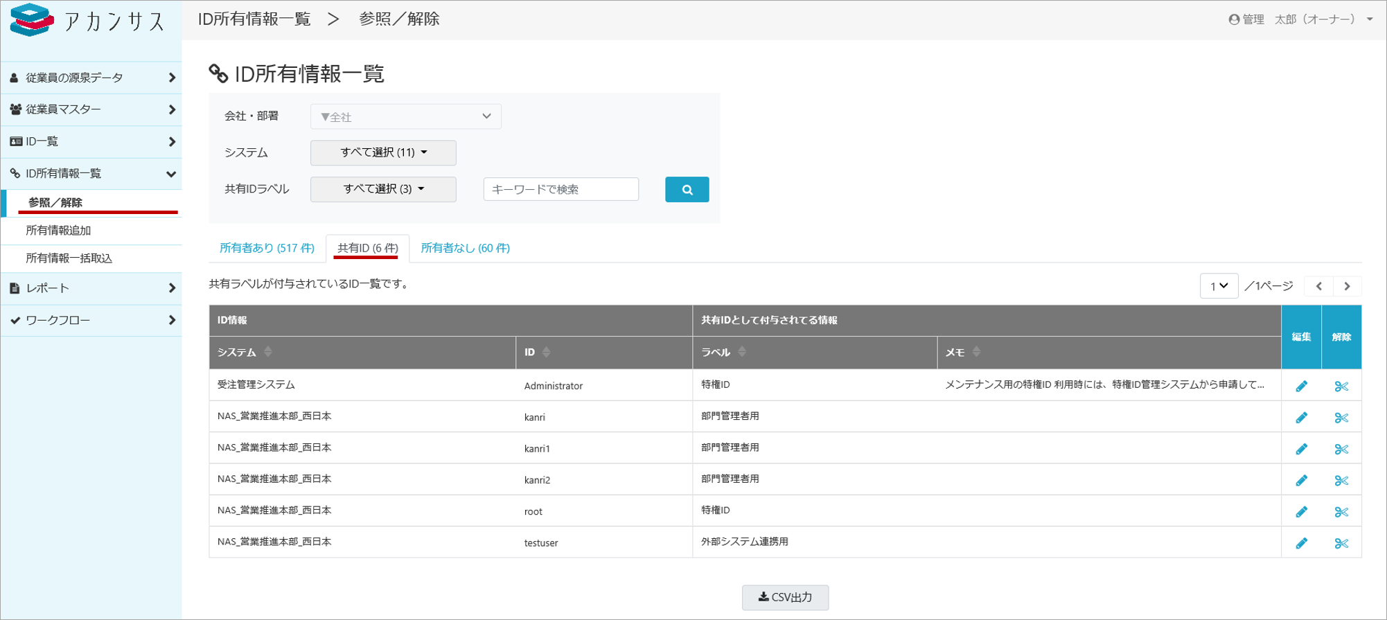 共有IDラベルが付与されたIDは、「所有者なしID」とは別に「共有ID」として管理されます。