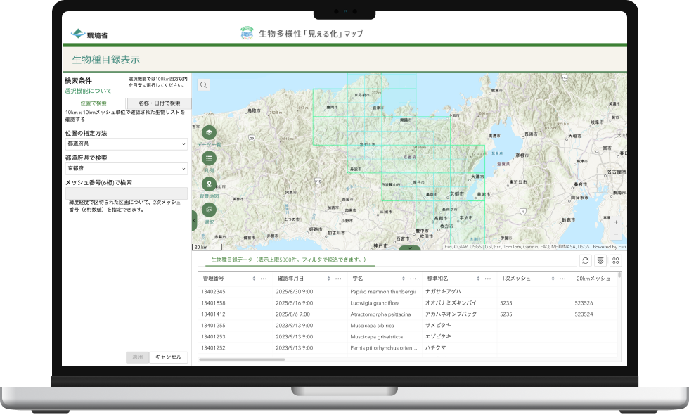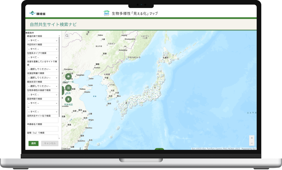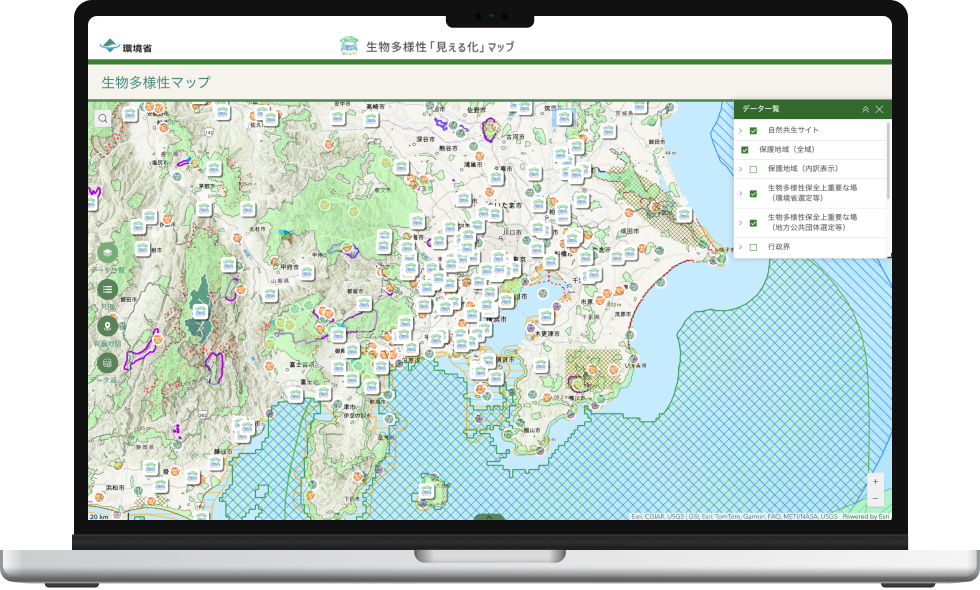 保護地域や自然共生サイト、生物多様性の保全上重要な場所などを地図上で直感的に確認可能。誰もがデータを活用できます。
