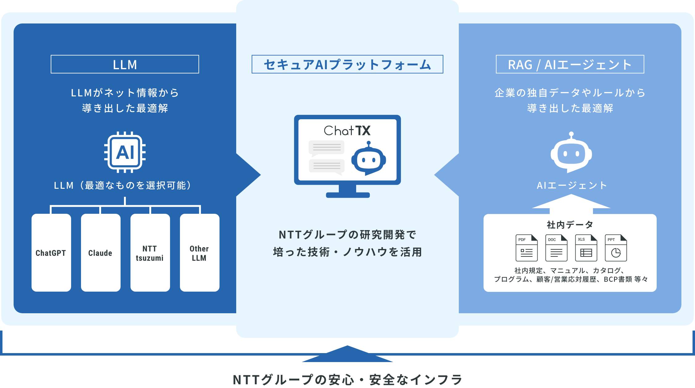 ChatTXはChatGPTやGemini等、各種生成AIを企業で活用しやすく設計した生成AIサービスです。