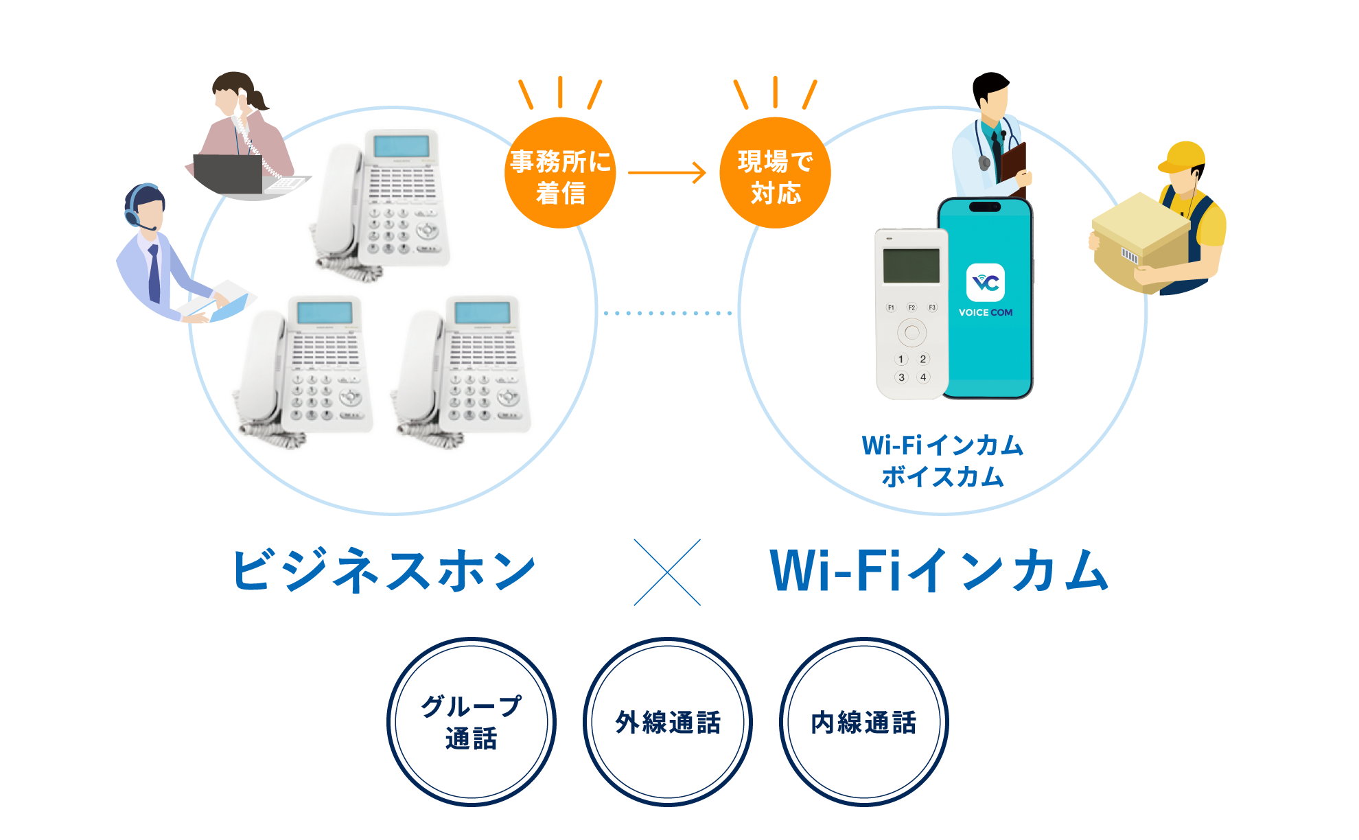 ビジネスホンと連携すれば、事務所の着信をWi-Fiインカムに転送でき、