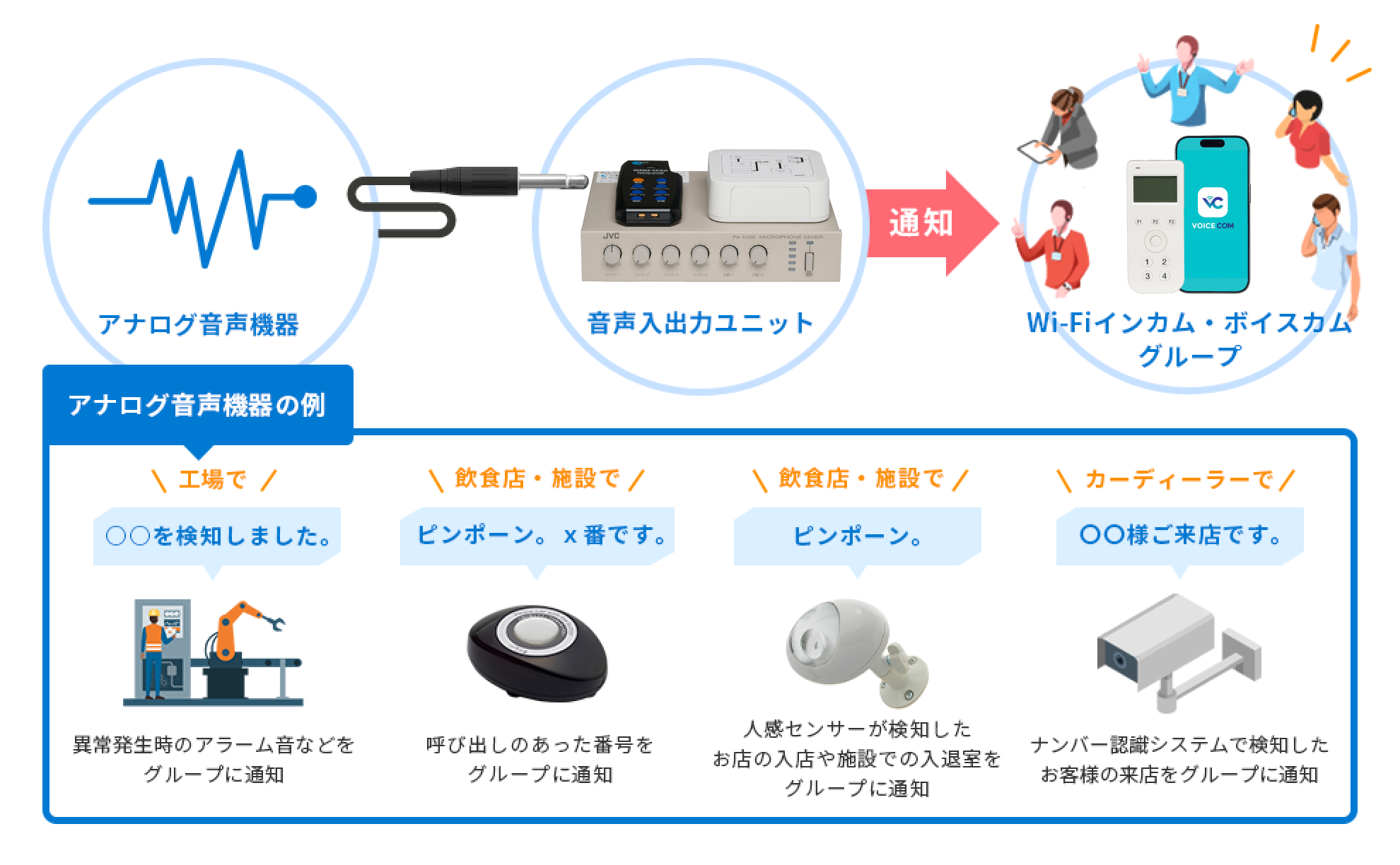 PLC連携や音声入出力ユニットを活用すれば、現場のエラー音や呼び出しをダイレクトにWi-Fiインカムに届けられます。