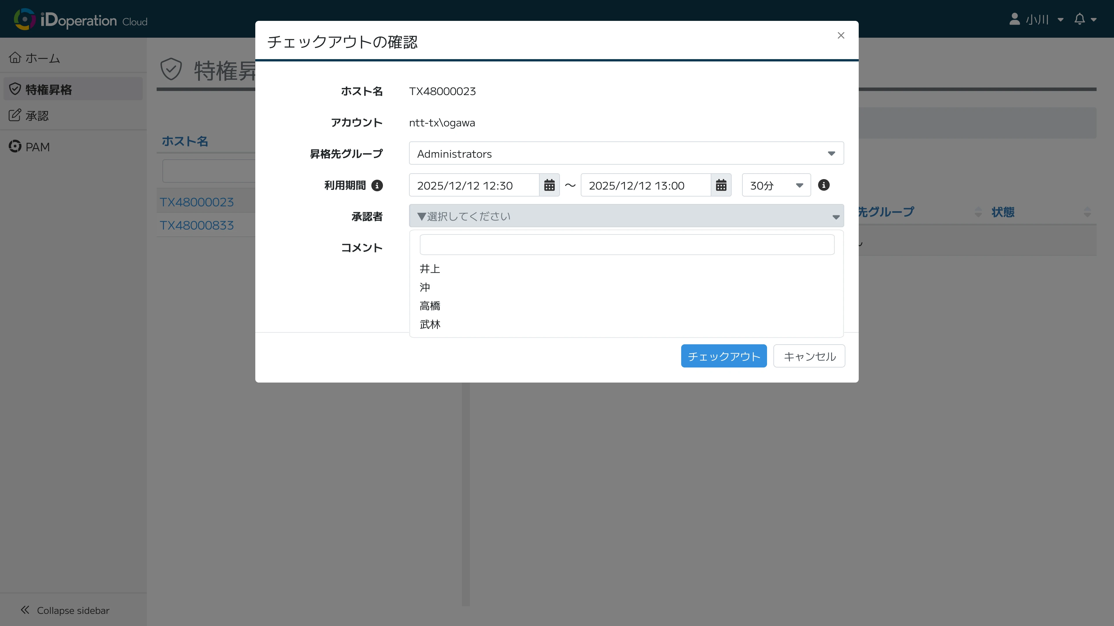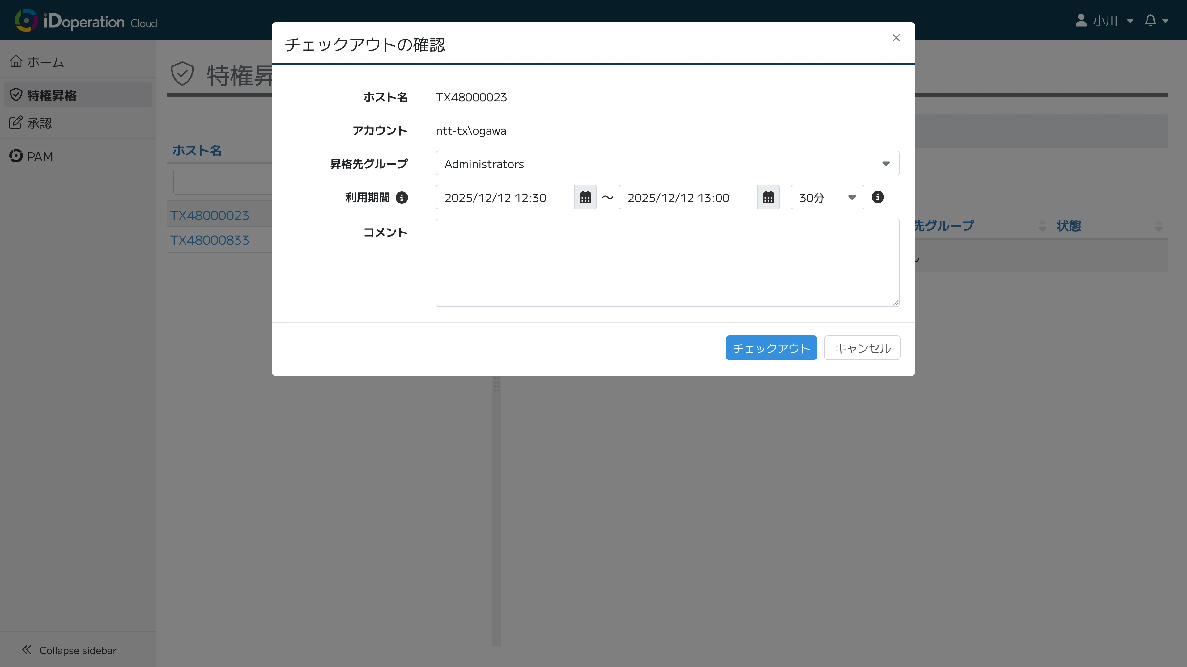 特権が必要な作業が発生した際、ユーザはセルフチェックアウトで一時的に特権昇格できます。「昇格先グループ(権限)」を指定してチェックアウトすると、自動で即座に特権昇格されます。 また、チェックアウトの予約設定が許可されている場合は、指定した利用期間に基づき自動昇格・降格されます。