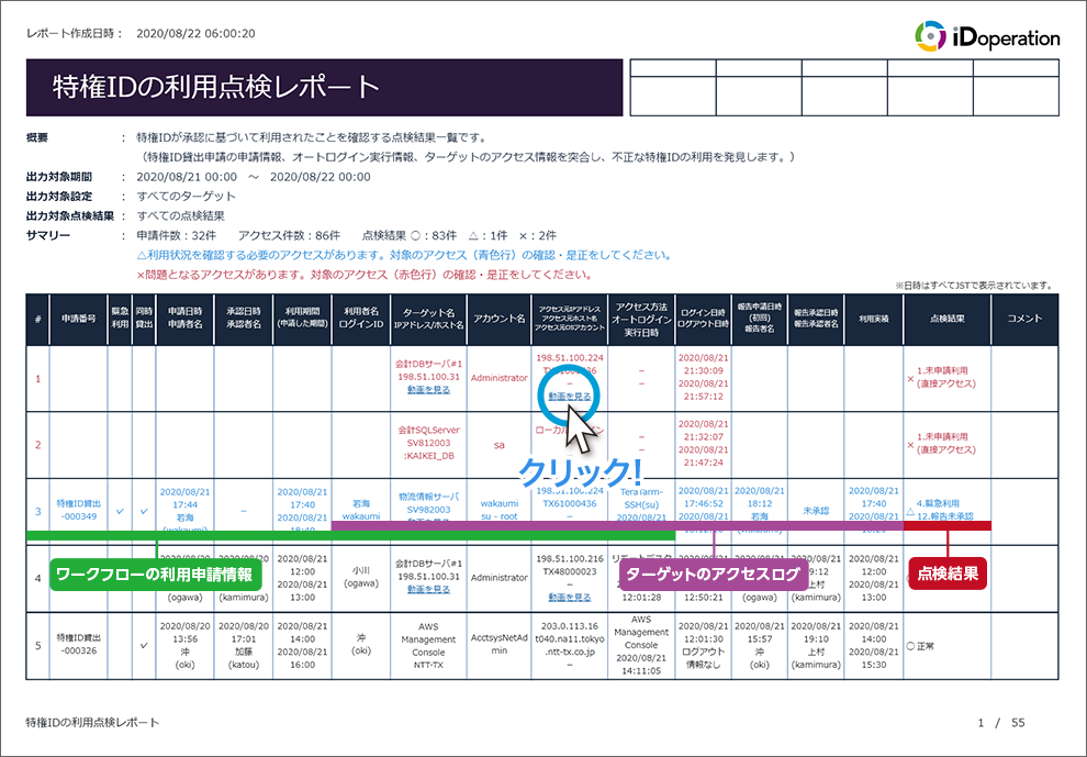 申請情報とターゲットから収集したアクセスログを突合せ、申請のないアクセスを不正アクセスとして検出します。アクセスログの点検結果は、わかりやすい点検レポートで確認できます。