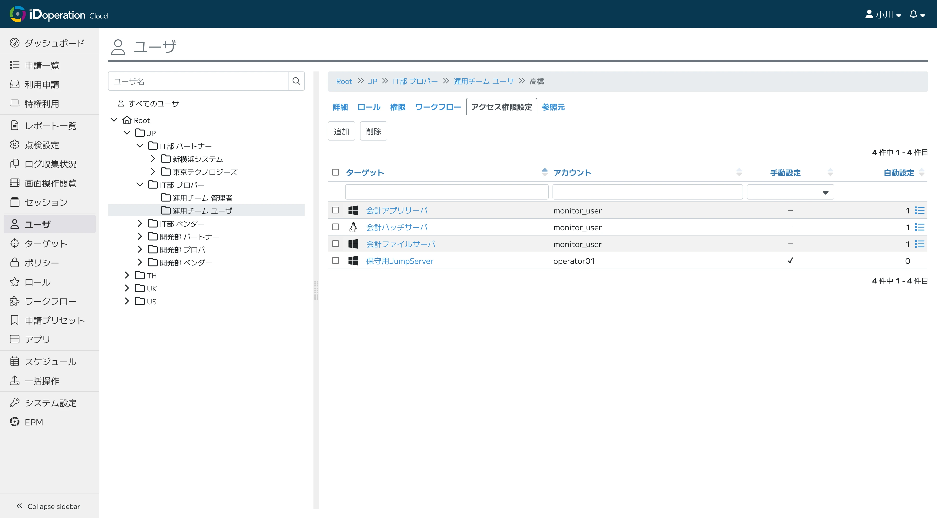 特権ユーザに付与するアクセス権限(ターゲットとアカウントの組み合わせ)は、ワークフローで付与した自動設定と、管理者が個別に付与した手動設定があり、どちらで付与したアクセス権限も正確に把握できます。
