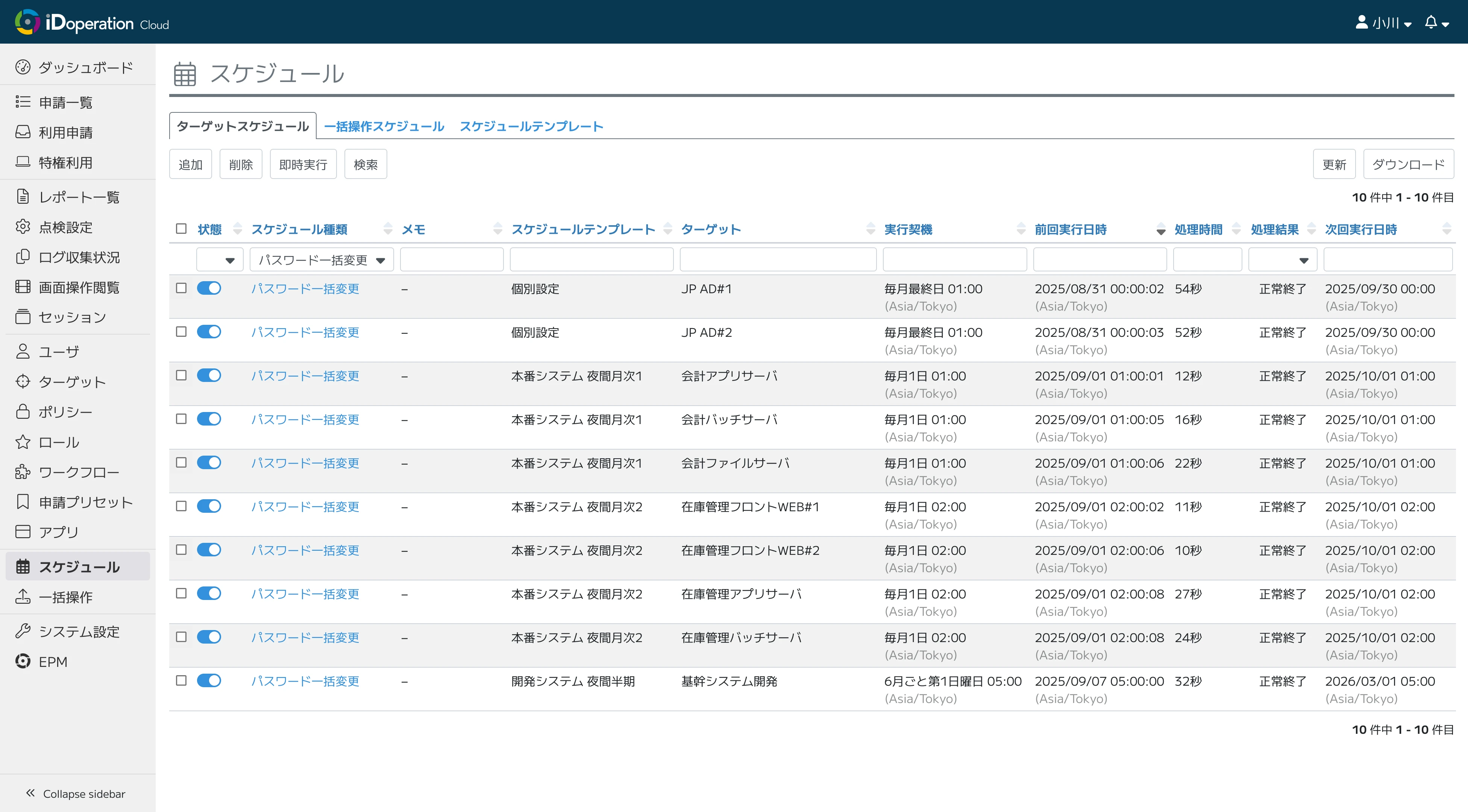 パスワード一括変更は、日次・週次・月次など事前に設定したスケジュールと、パスワードポリシー(パスワード長や利用可能文字など)に沿って自動実行できます。管理者は、ポータル画面で処理結果を確認するだけで、適切なパスワード管理を維持できます。