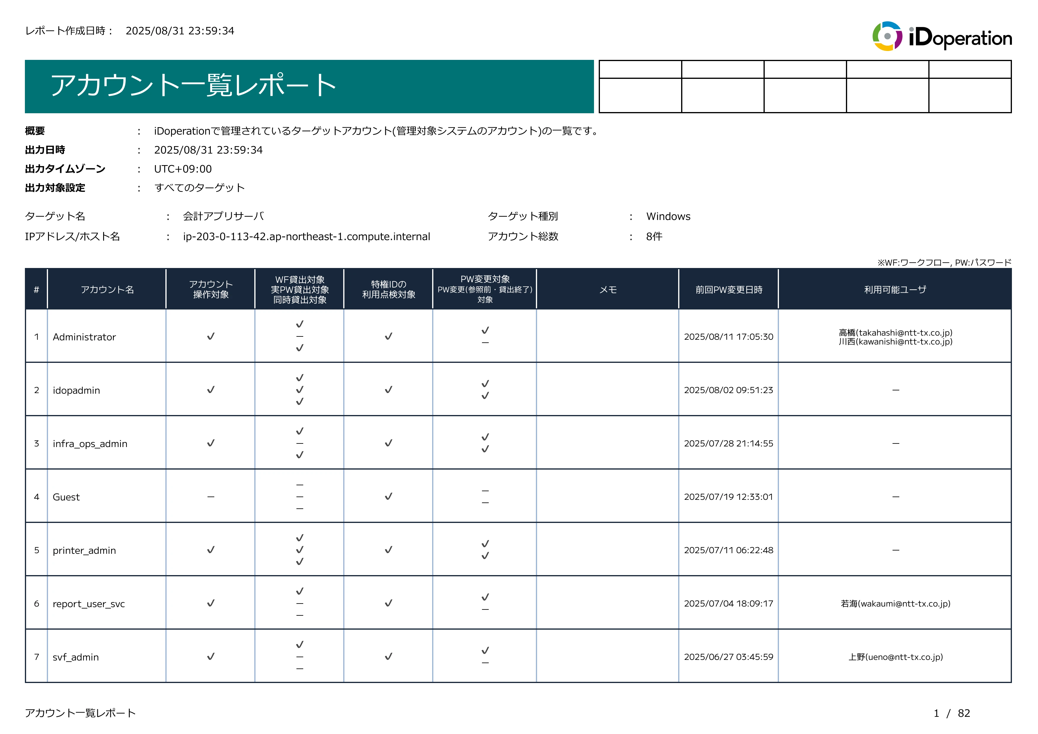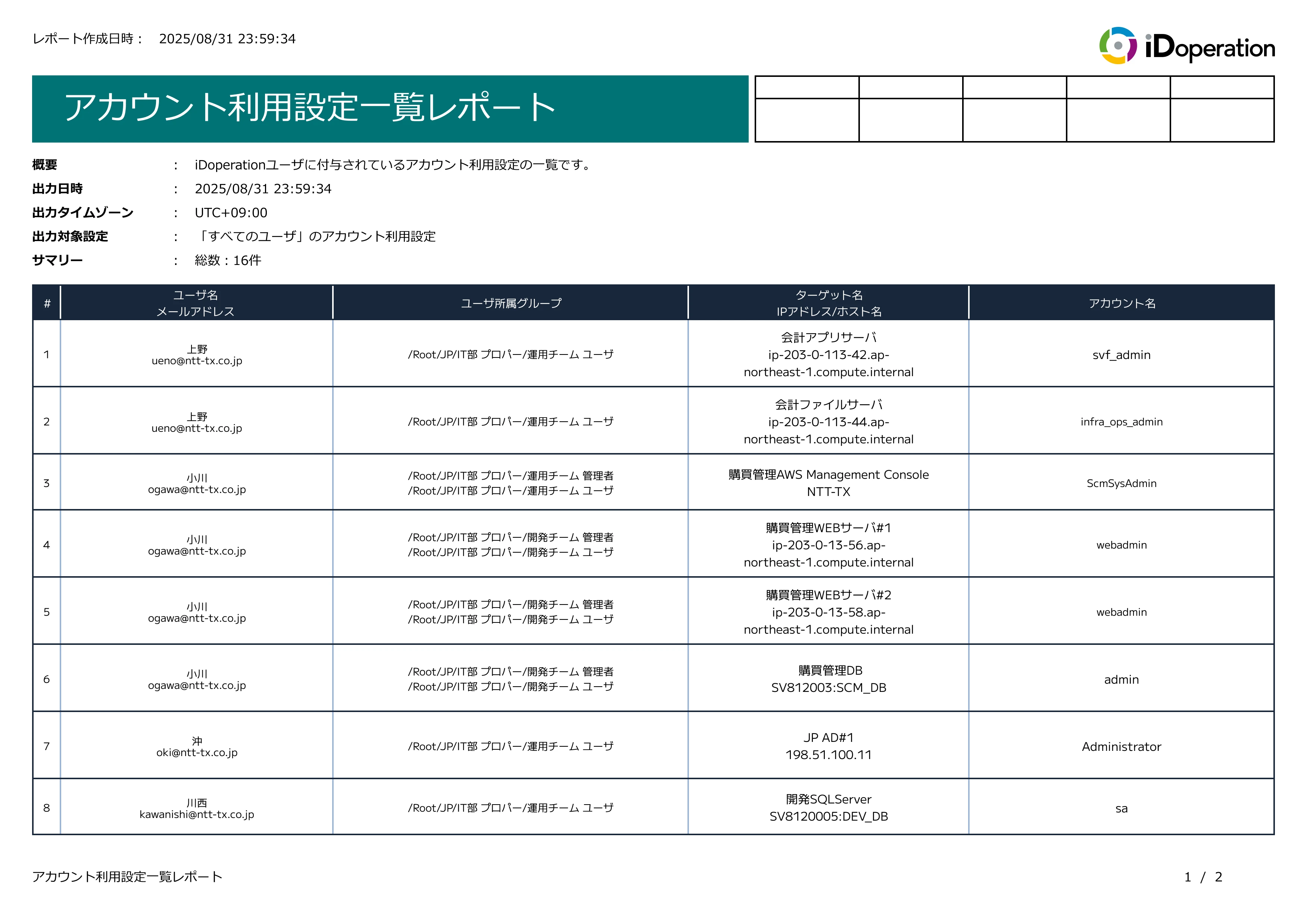 「アカウント一覧レポート」では、iDoperation PAM Cloud で管理している特権ID(ターゲットのアカウント)の一覧を確認でき、不要な特権IDの把握と排除を支援します。