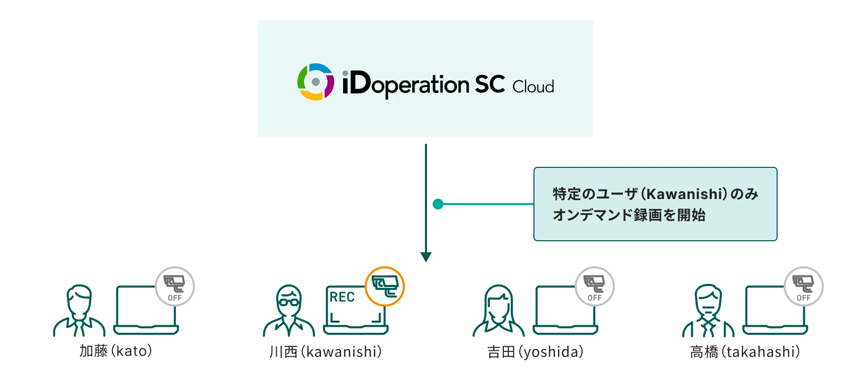 iDoperation SC Cloudでは、全ての端末にSC Agent を常駐させた状態で、特定のユーザのみ、オンデマンドで録画を開始できます。たとえば、退職予定者など、リスクが高まったユーザに絞り、必要な時に録画を開始することでストレージ容量を抑え、コストとセキュリティの両立を支援します。