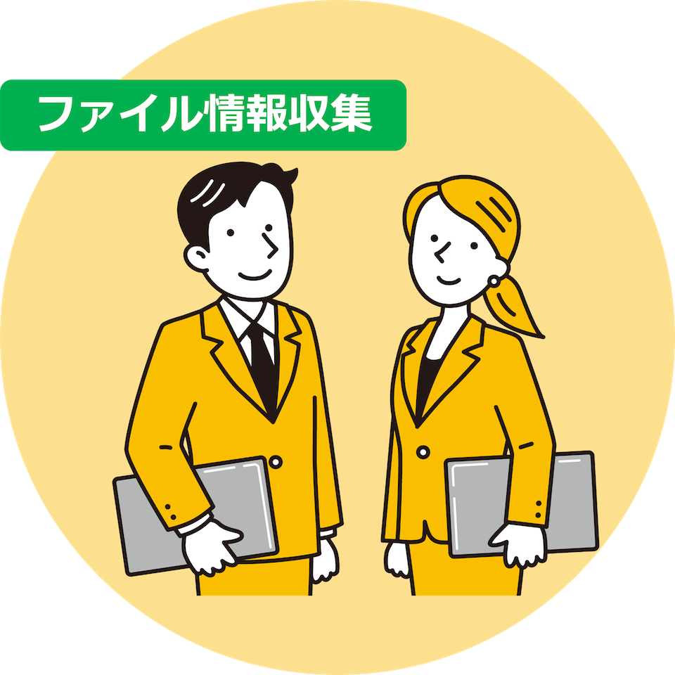 格納ファイル情報を自動収集社内外の全PCに格納されたファイル情報を定期的に自動で収集。持ち出したPCの紛失や盗難があっても、個人情報や機密情報を持ち出していないことの証跡が残っているので、適切な対応が図れる!