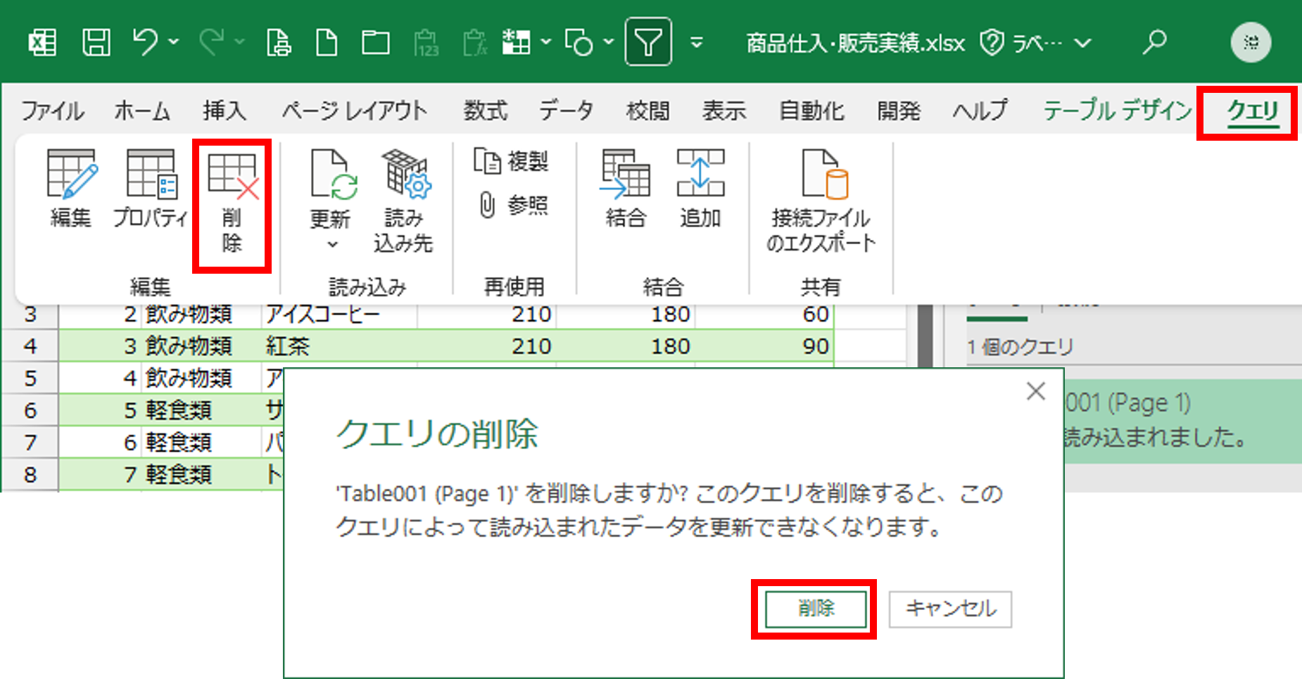 この操作でクエリの削除画面の「削除」ボタンを押下します。