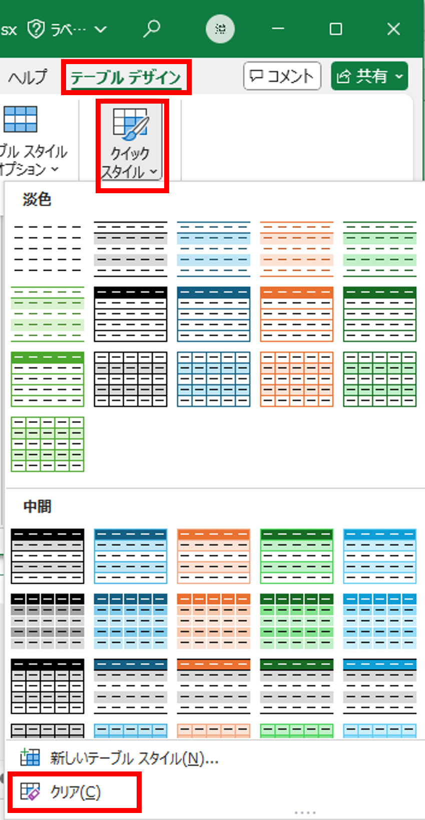 テーブルデザイン → クイックスタイル → クリア の順番に選択します。