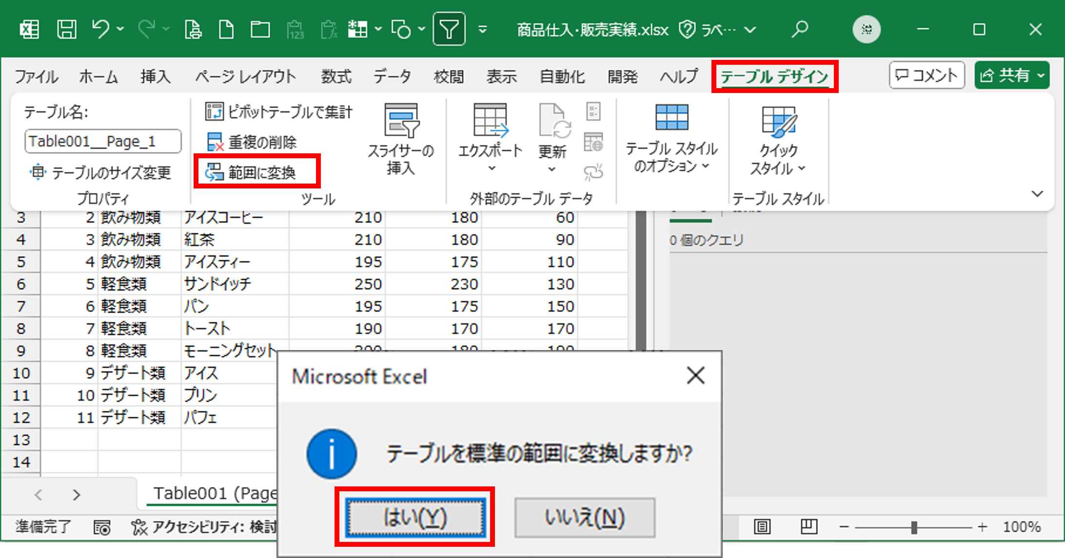 テーブルデザイン → 範囲に変換 の順番に選択します。