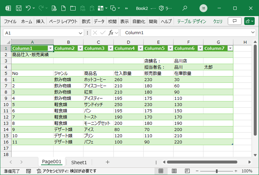 上記の操作により、縞模様で設定されていたテーブルスタイルがクリアされました。