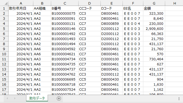この取引データをB列のAA組織毎に分割したいのですが、良い方法はありますでしょうか。