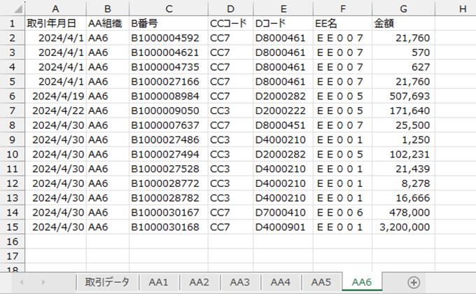 「AA1」といった組織名のシートを追加して、該当する組織の取引データのみにするようなイメージです。