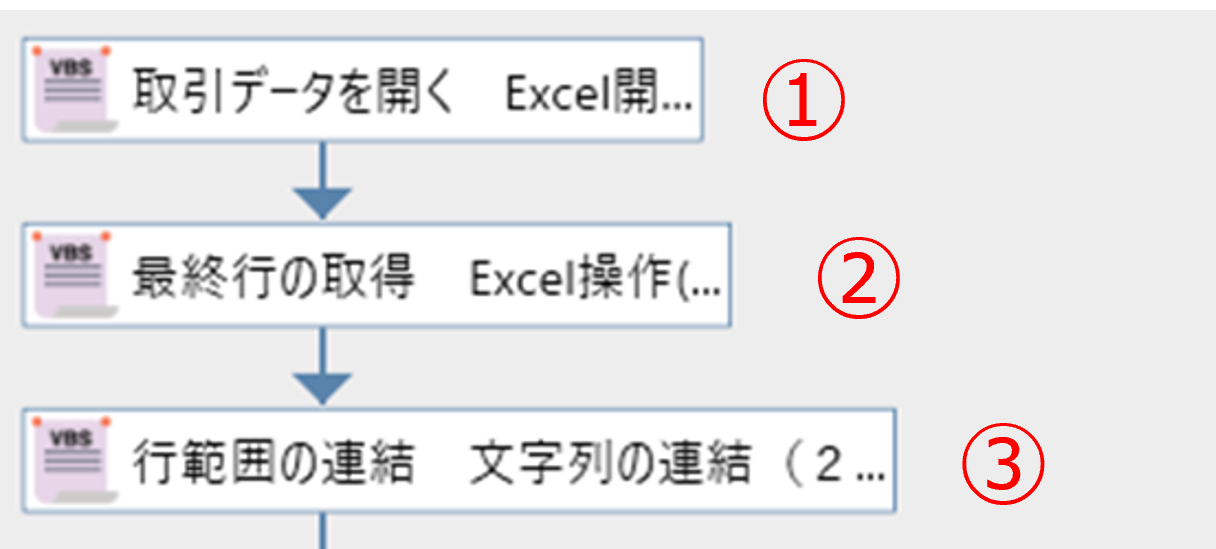 ①「Excel開く(前面化)」で取引データを開きます。