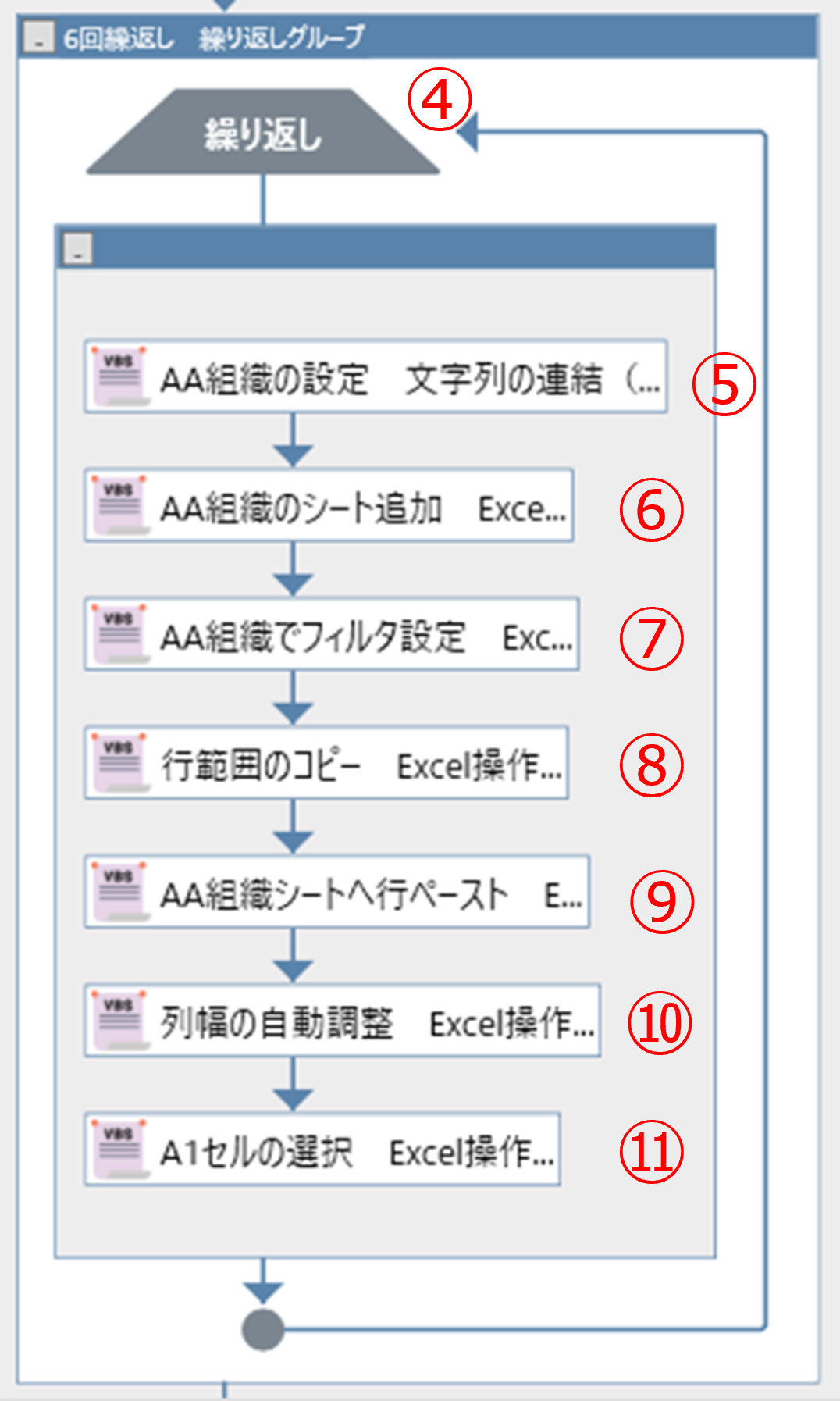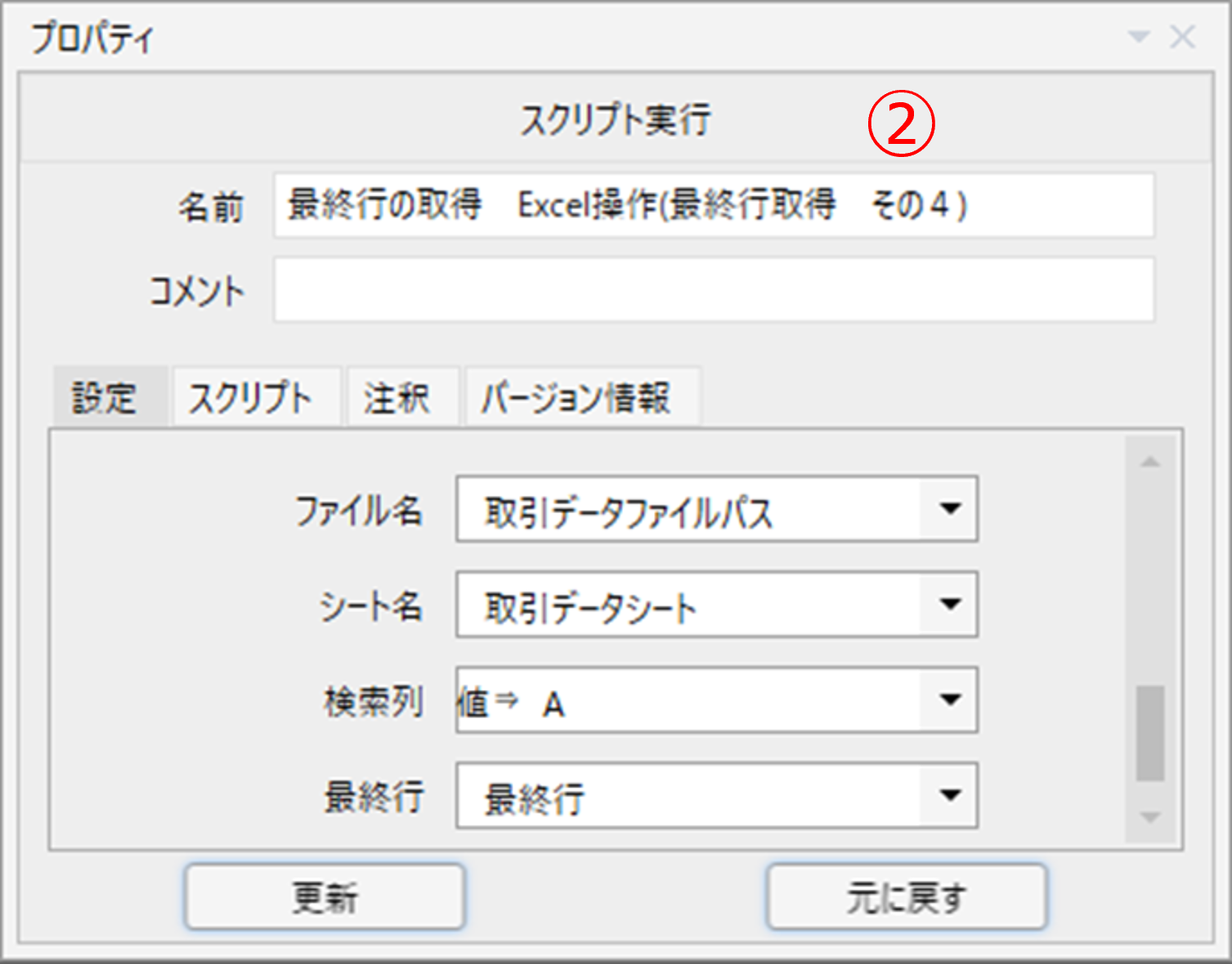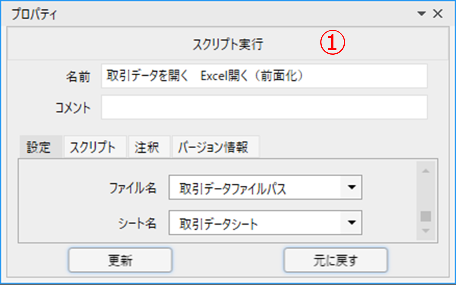 ファイル名には変数「取引データファイルパス」、シート名には変数「取引データシート」を指定しています。