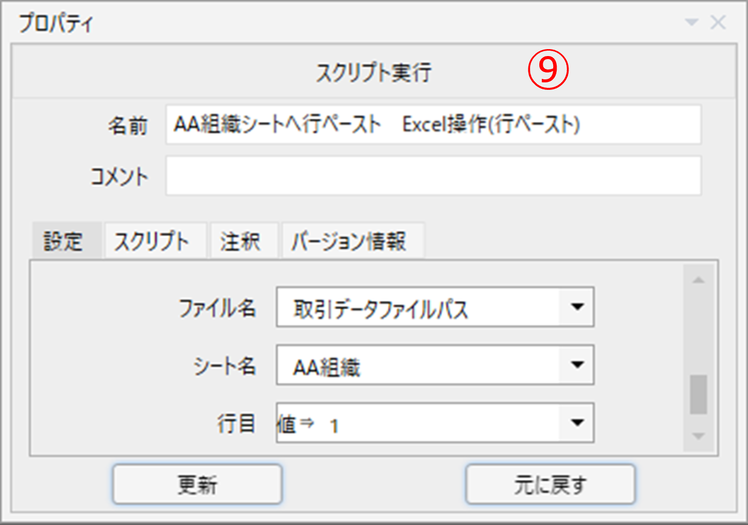 シート名に変数「AA組織」、行目に値で「1」を指定します。