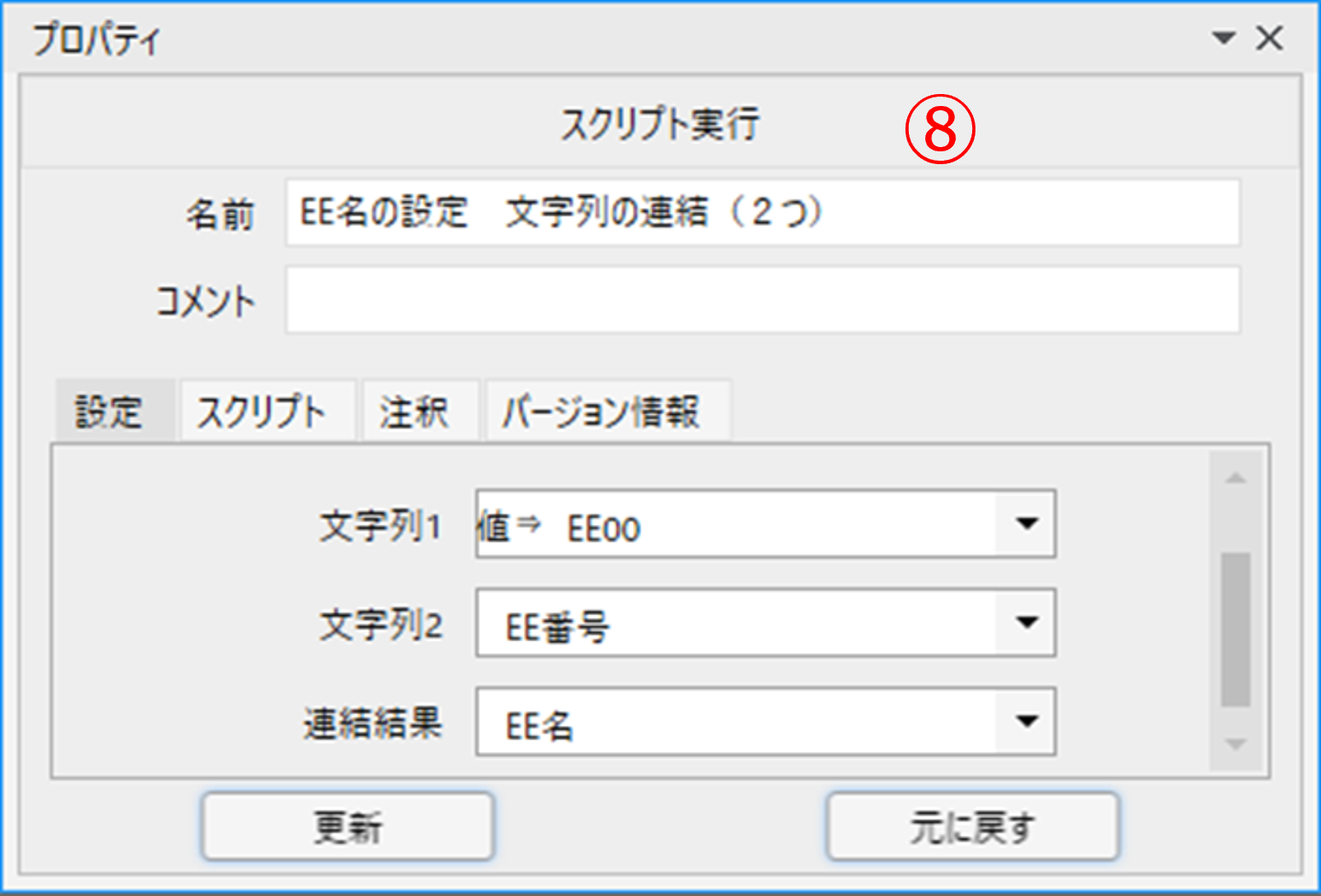 文字列1に値で「EE00」、文字列2に先ほどの計算結果の変数「EE番号」を指定して、連結結果として変数「EE名」に求めます。