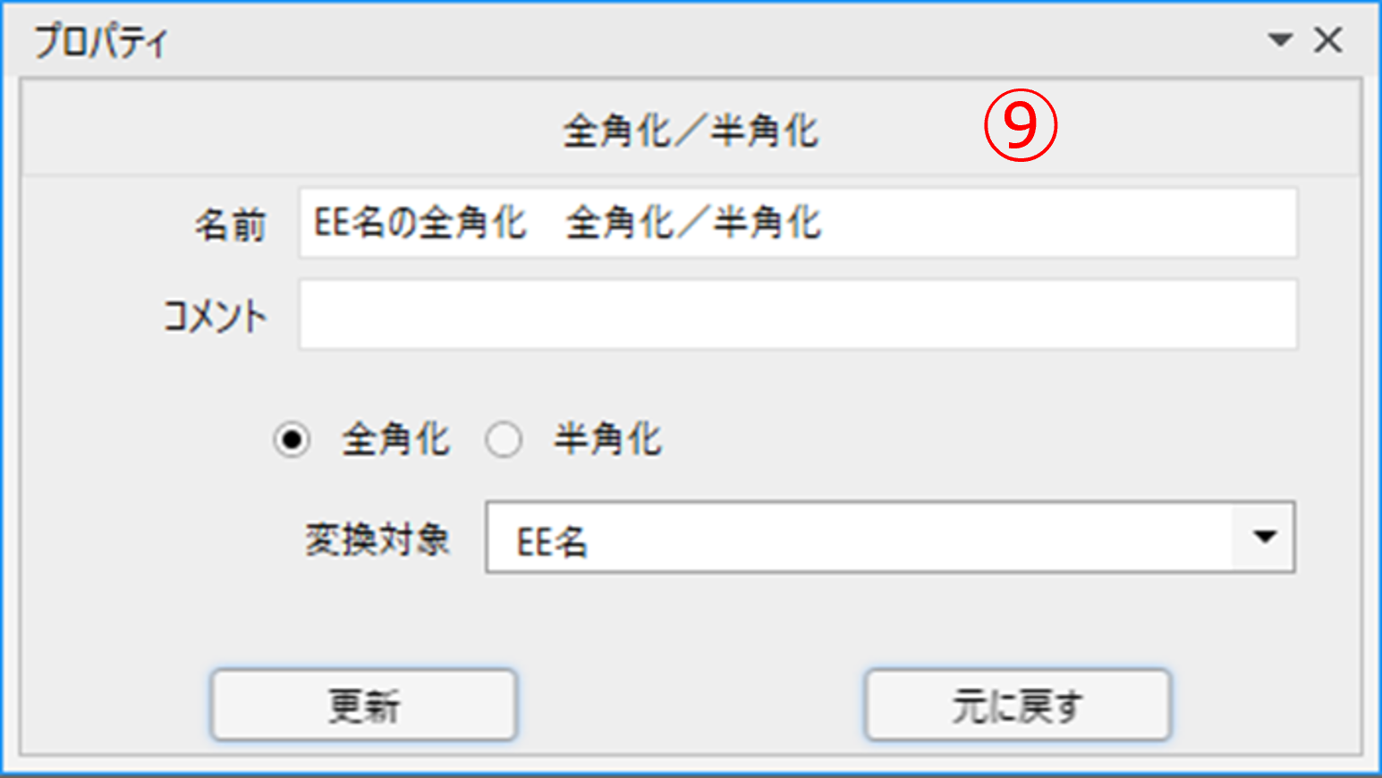 EE名は「EE001」のように全角で設定されているため、⑧で求めた変数「EE名」を全角化します。