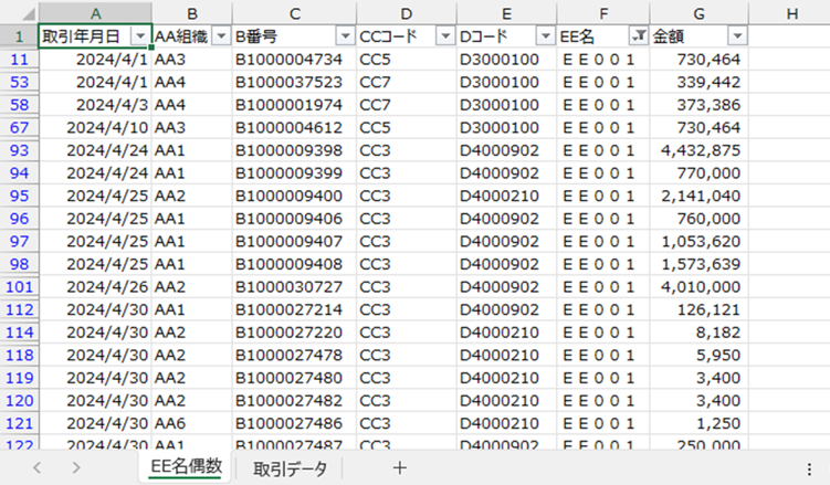 繰返しの1回目はF列のEE名が「EE001」でフィルタ設定された状態になります。