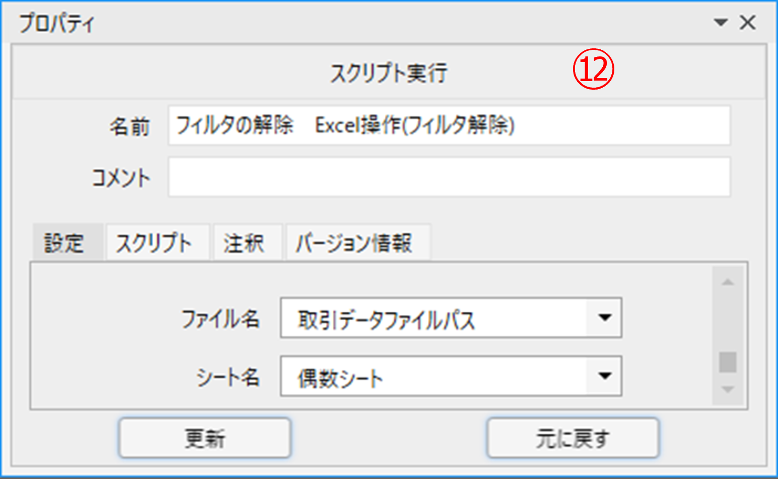 ⑫「Excel操作(フィルタ解除)」にてフィルタ設定を解除します。