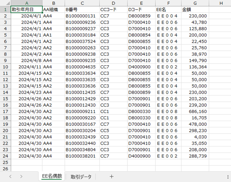 「EE002」「EE004」「EE006」「EE008」の行のみが残されていることを確認できました。